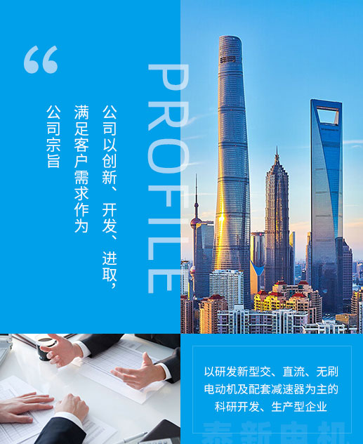 淄博博山泰新電機(jī)有限公司位于山東省重要工業(yè)基地淄博博山,風(fēng)光秀麗,交通便利,經(jīng)濟(jì)基礎(chǔ)雄厚。是以研發(fā)新型交、直流、無刷電動(dòng)機(jī)及配套減速器為主的科研開發(fā)、生產(chǎn)型企業(yè),主營各類印刷機(jī)專用電動(dòng)機(jī),數(shù)控機(jī)床用力矩三相異步電動(dòng)機(jī),紡織機(jī)械用高速電動(dòng)機(jī),食品包裝及環(huán)保設(shè)備用各類交直流專用電動(dòng)機(jī)。